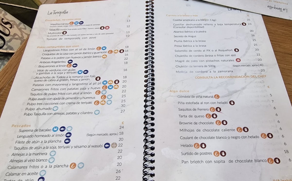 La Tasquilla in Almería offers a delightful array of dishes that showcase the flavors of Spain with a modern twist. The menu is well-rounded, offering everything from hearty meats to light seafood and indulgent desserts. A standout is the Pulpo A la Brasa, a tender, smoky grilled octopus that’s perfectly complemented by its charred edges. The Taco de Atún delivers a fresh, vibrant bite, with tuna taking center stage in a soft taco shell. For those who enjoy rich, comforting appetizers, the Croquetas Caseras are a must-try, with their creamy interior and crispy exterior. As for the heartier options, the Chuletón Rubia Gallega is a showstopper - a generous portion of Galician beef that’s tender and full of flavor, ideal for meat lovers. The Ensalada de Verduras Asadas provides a lighter, more refreshing contrast, with a delicious mix of roasted vegetables drizzled in olive oil. Seafood enthusiasts will appreciate the Boquerones Al Limón, which are perfectly fried anchovies with a zesty lemon kick. The menu also includes tempting desserts like the Coulant de Chocolate, a rich chocolate lava cake, and the decadent Tarta de Tres Chocolates, a multi-layered chocolate dessert that melts in your mouth. Pair any of these dishes with a glass of Tinto de Verano Casero, a homemade red wine spritzer that’s the perfect refreshment for a sunny day. Don’t miss the Bapao, a steamed bun filled with savory goodness, or the delicate Milhojas de Chocolate, a crispy puff pastry layered with chocolate. For those craving a light bite, the Tapa de Arroz offers a satisfying taste of traditional Spanish rice. Each dish at La Tasquilla is carefully prepared, making this spot an exceptional choice for those looking to indulge in authentic Spanish flavors with a contemporary flair.